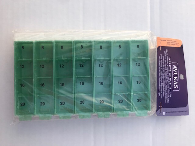 Perinteinen tarjotin-mallinen tablettiannostelija, jossa jokaiselle viikonpäivälle oma irrotettava lokerikko. Irrotettavassa lokerikossa neljä eri lokeroa eri aikoihin otettavia lääkkeitä/vitamiineja varten.