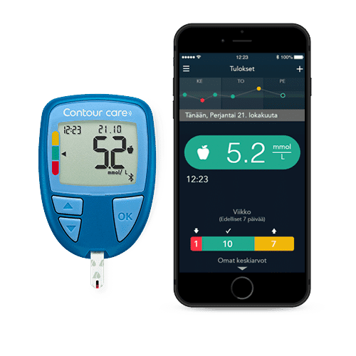 Ilmainen CONTOUR®DIABETES -sovellus tukee diabeteksen omahoitoa. Voit lisätä mittaustuloksiin hyödyllisiä tietoja ja sisältöä.