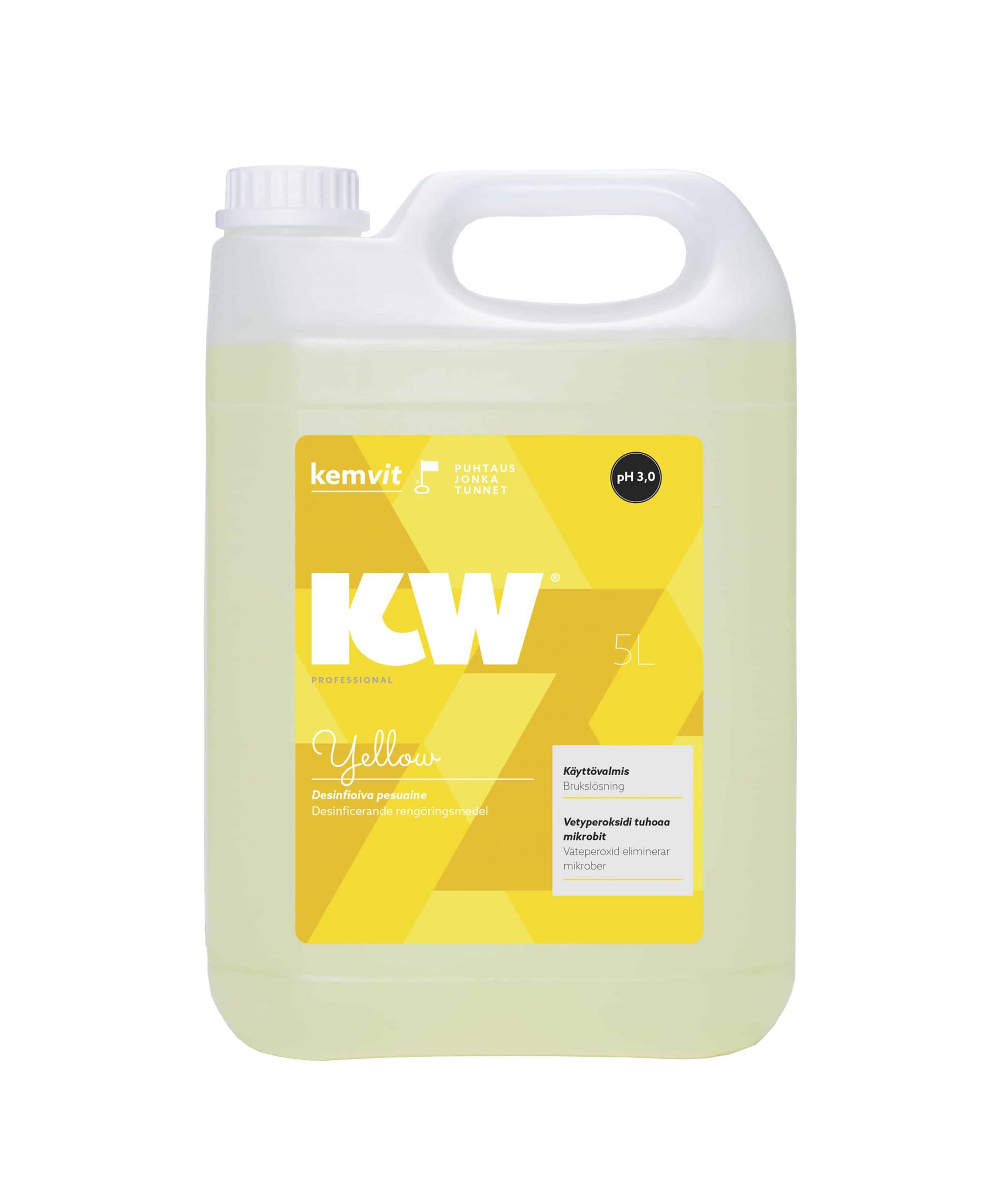 Valmis käyttöliuos kaikkien vettä sietävien pintojen puhdistamiseen ja desinfiointiin. KW Yellow on kehitetty